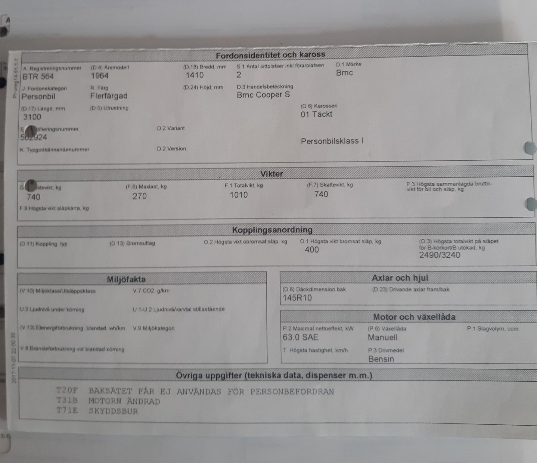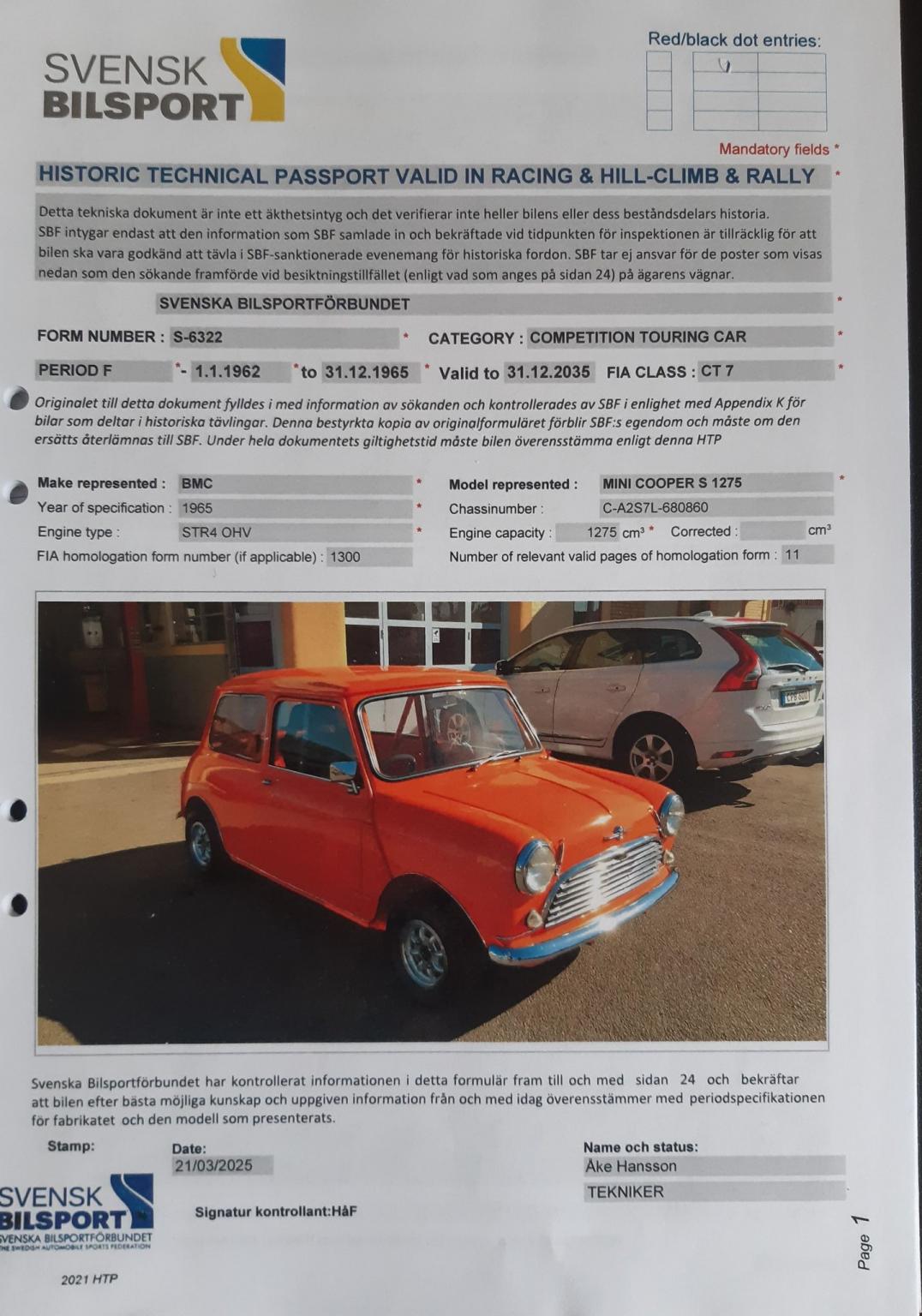 A genuine historic 1275 Cooper S for historic racing. Completely rebuilt with hot-dip galvanised front and rear chassis. Spax shock absorbers. Engine and diff-equipped gearbox built by Sweden's foremost Hundkojemekaniker Per Malmberg. Nationally inspected in Appendix K.